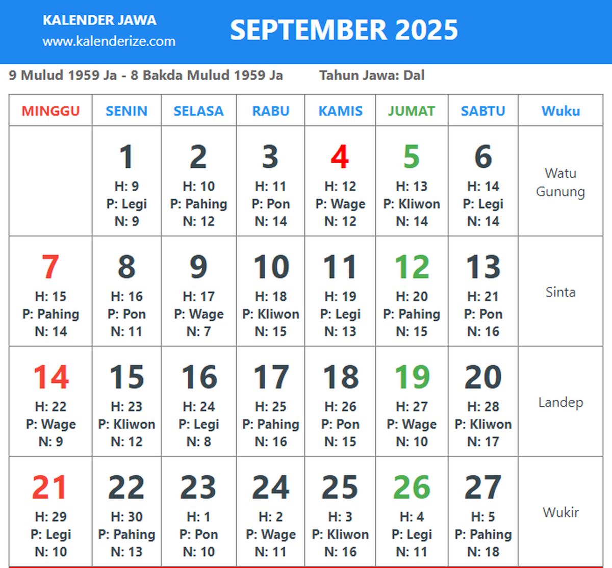 - 5 Juli 2025: Sabtu Pon, 9 Suro 1959 Dal, 9 Muharram 1447 Hijriah