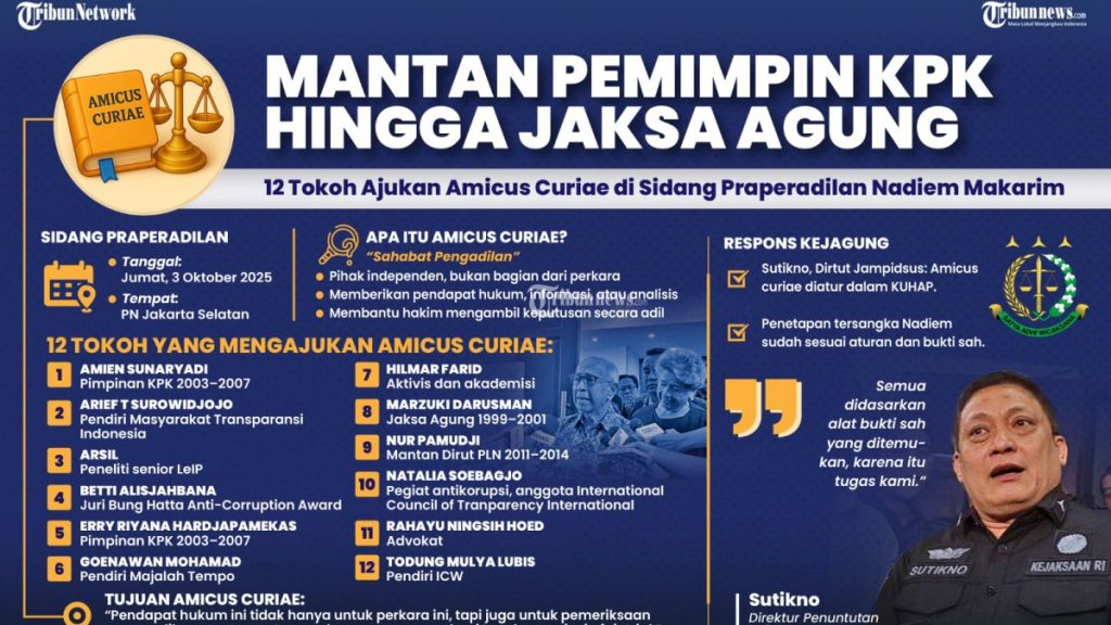 Dalam proses praperadilan Nadiem, sebanyak 12 tokoh antikorupsi memberikan amicus curiae. Mereka termasuk mantan Jaksa Agung Marzuki Darusman dan eks pimpinan KPK Amien Sunaryadi. Amicus curiae disampaikan langsung dalam sidang perdana praperadilan Nadiem di Pengadilan Negeri Jakarta Selatan pada Jumat (3/10/2025).